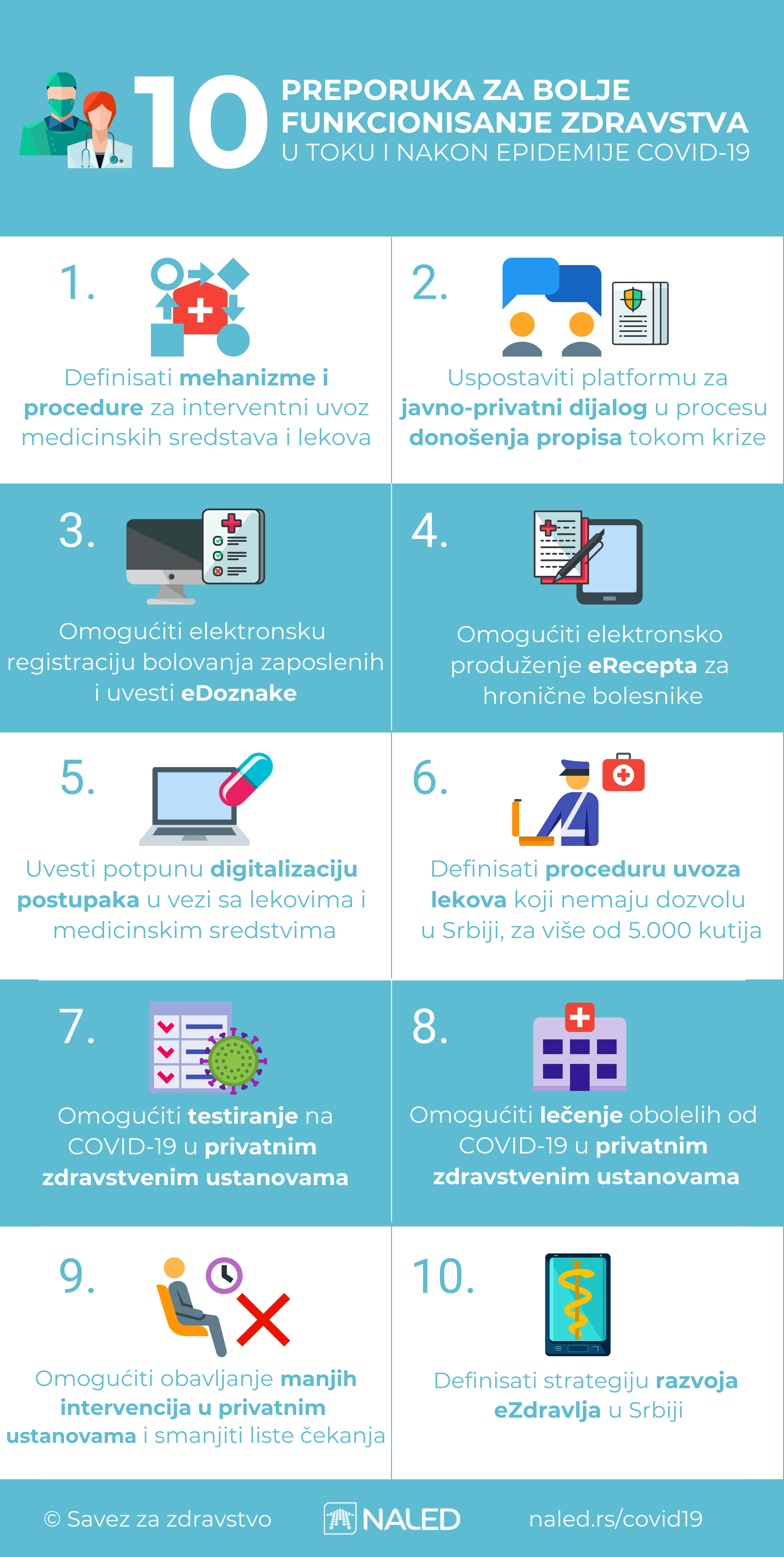 NALED-ov Savez za zdravstvo dostavio je predsednici Vlade, Ministarstvu zdravlja, RFZO-u i Agenciji za lekove predlog mera za ubrzani uvoz robe, aktiviranje kapaciteta privatnog sektora u kriznim situacijama i uključivanje privrednih i strukovnih udruženja u procese donošenja odluka i propisa.